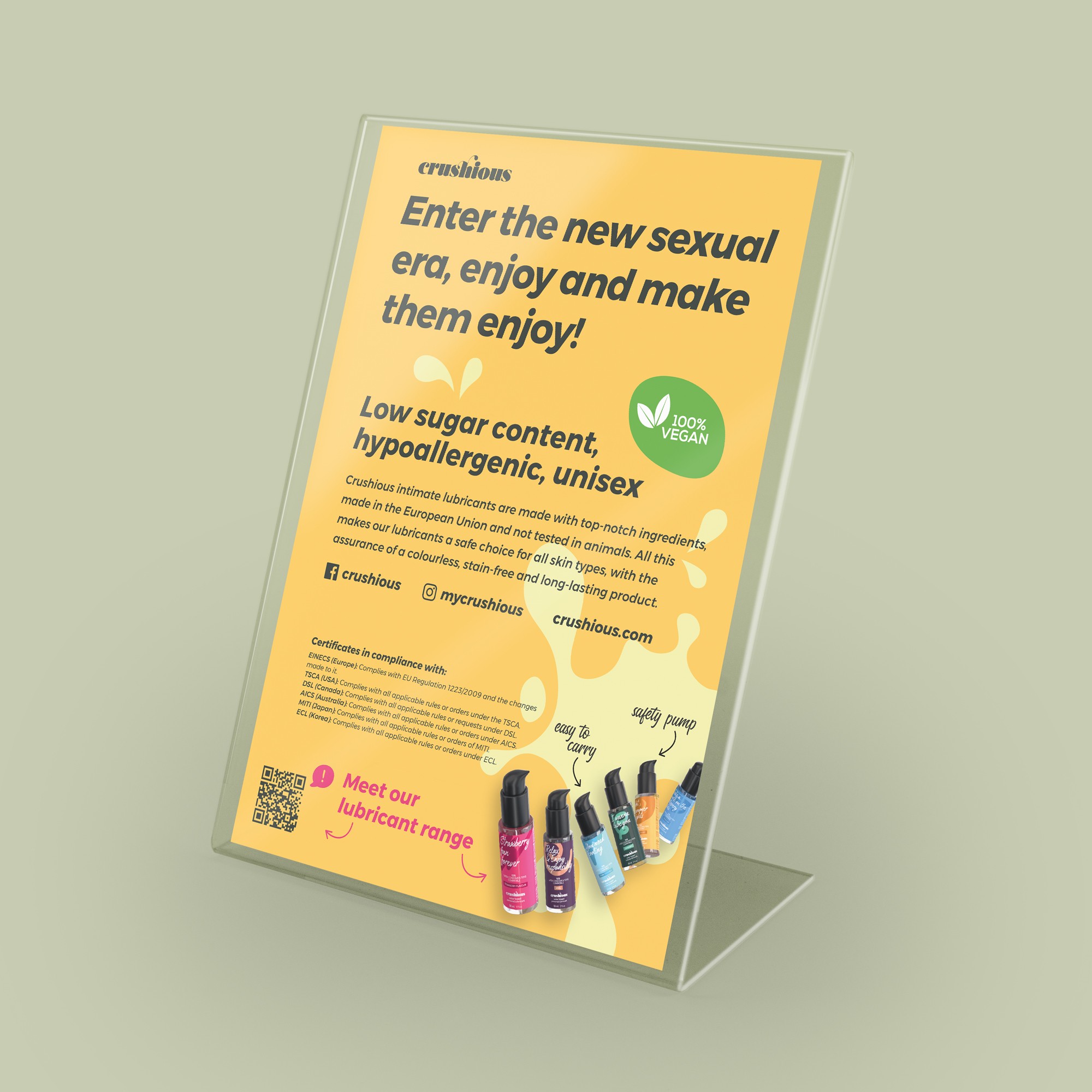 Cet expositeur est accompagné d’un expositeur de taille A5 avec de la publicité concernant les lubrifiants Crushious en anglais.